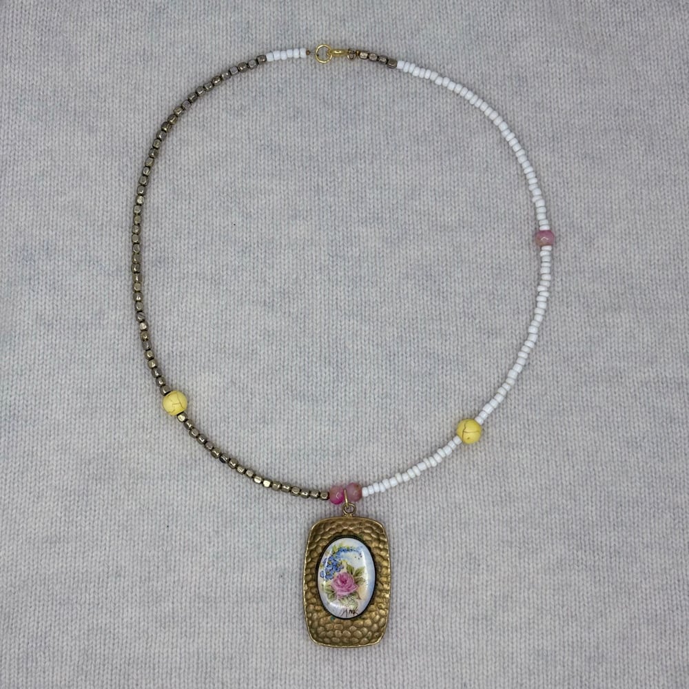 Thoughtfully handmade from preloved beads, adorned with a vintage pendant. This piece has a heartfelt connection with the past.
