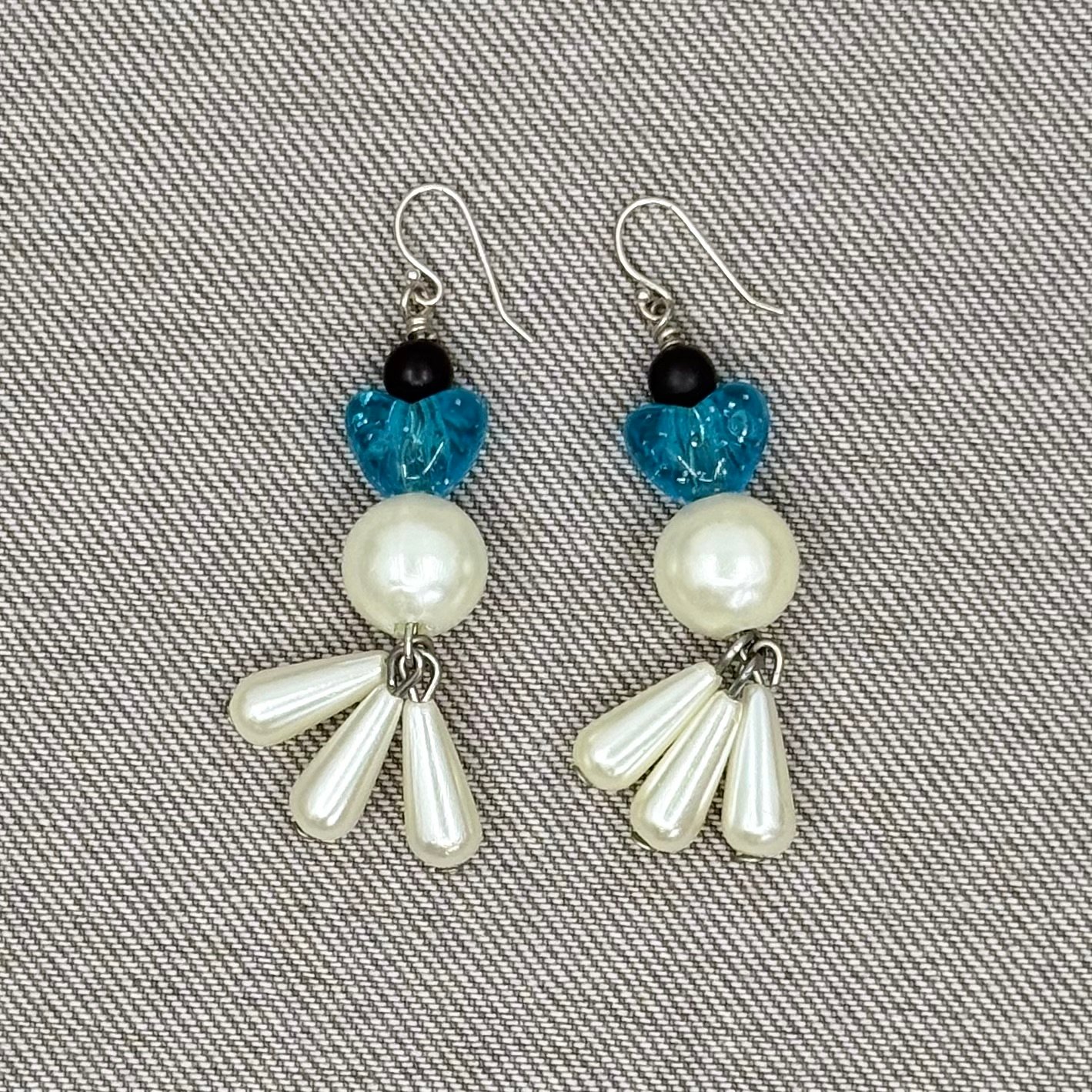 Thoughtfully handmade from preloved pearl beads and teal glitter heart. A drop of love falling from the lobe.